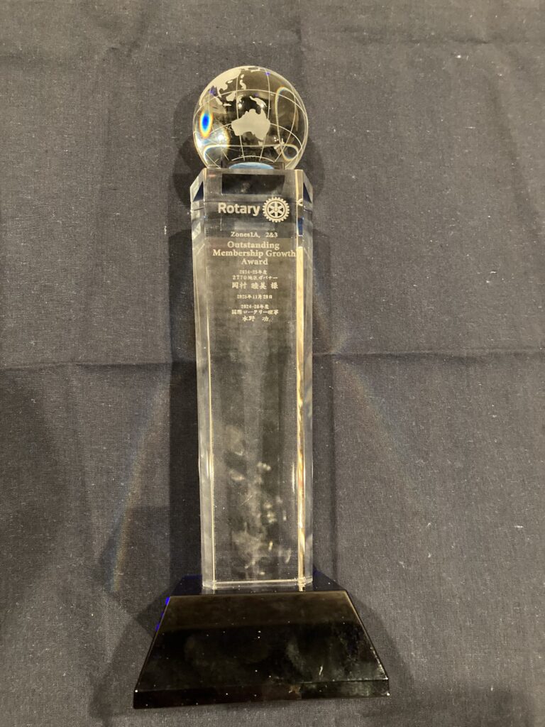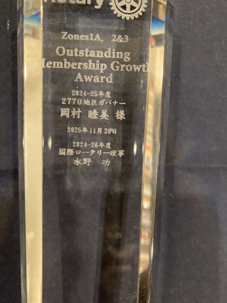 2025年11月20日開催されました、第54回ロータリー研究会において、岡村睦美直前ガバナーが、「Outstanding Membership Growth Award」を受賞されました。